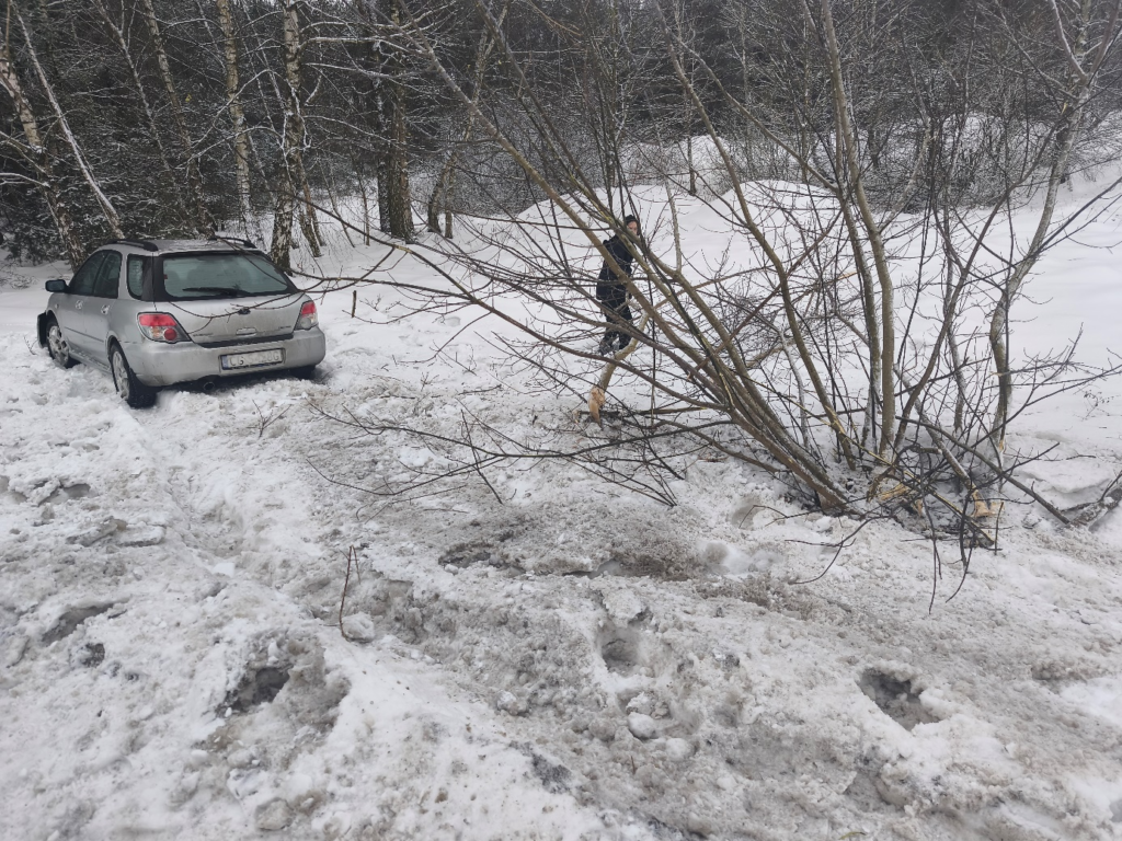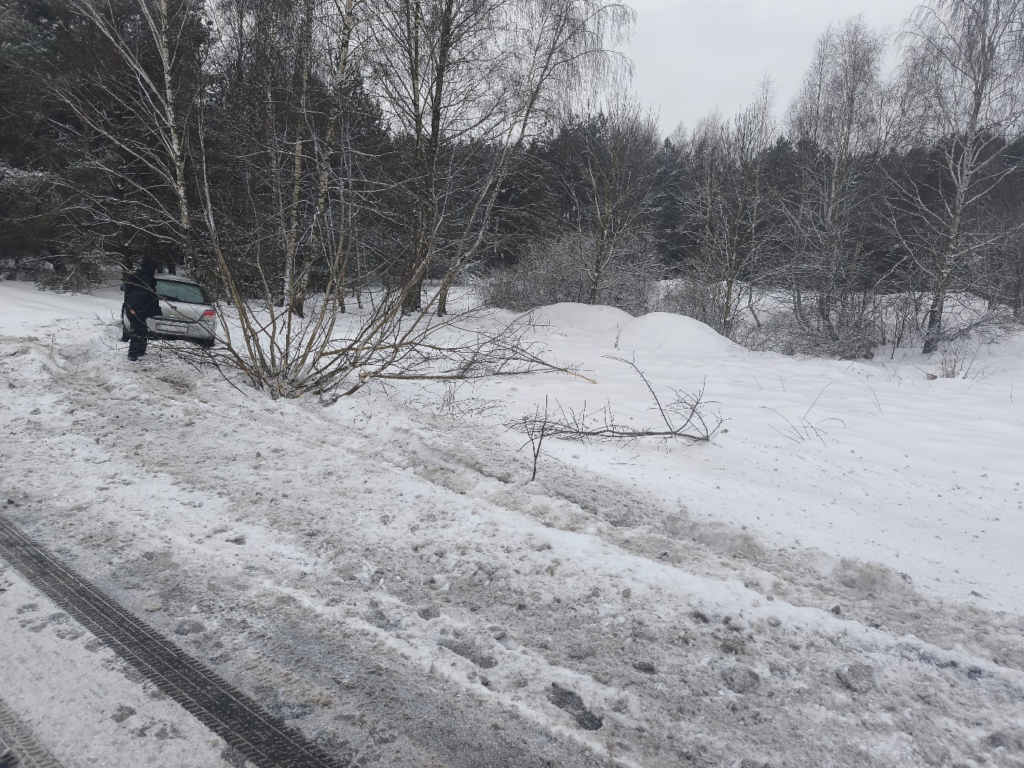 Jak widać pojazd przejechał spory kawałek drogi nim ugrzązł w ciężkim, mokrym śniegu. Paradoksalnie ten sam biały materiał zatrzymał pojazd przed szpalerem drzew. Gdyby nie on, całe to zdarzenie mogłoby się skończyć tragicznie.