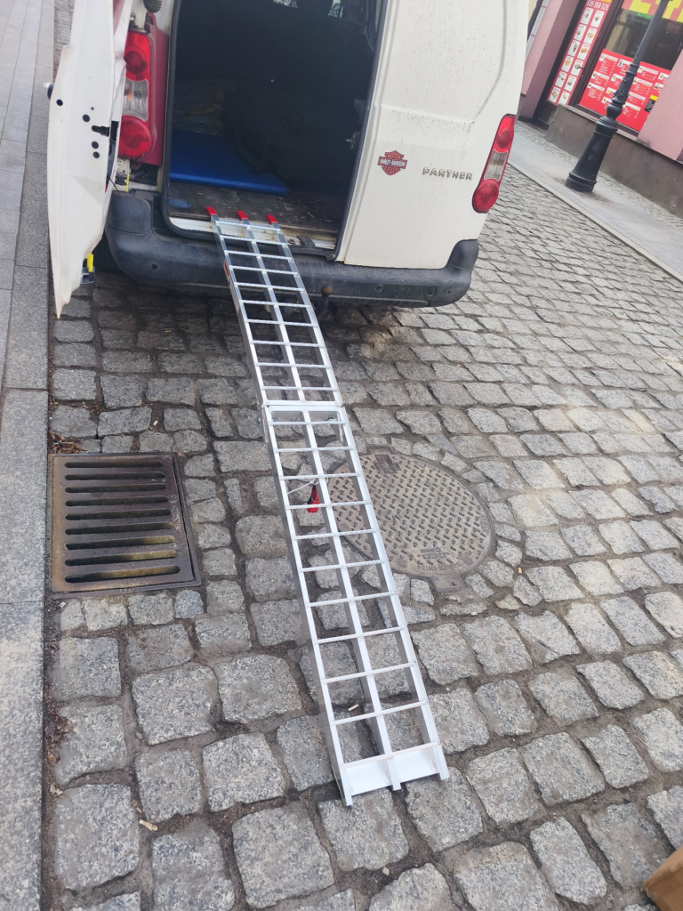 W przypadku tej konkretnej wyprawy, musiałem zaopatrzyć się w mały dodatek techniczny, bez którego nie byłbym w stanie zapakować, ani zdjąć motocykli z busa. Chodzi o rampę załadunkową.