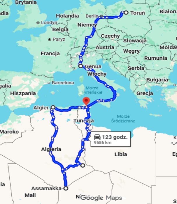 Jako pierwszy krok, który dość szybko okazał się błędny było planowanie trasy. Z Torunia do włoskiego miasta portowego Genua to około 1700 km. W zależności od tego, jaką trasę wybrać. By oszczędzić czas chcieliśmy pojechać samochodem, a motocykle wieść na przyczepce. Takie rozwiązanie pozwoliłoby, na dojazd w okolice Bergamo (Włochy) w jakieś szesnaście godzin, zmieniając się jako kierowcy. Ta sama trasa motocyklami wymagałaby co najmniej dwóch dni ostrej jazdy motocyklem. W praktyce trzy. W obie strony to już o cztery dni dłużej niż samochodem. Cztery dni, które można by wykorzystać na jeżdżenie po Algierii. W okolicach tego miasta planowaliśmy zostawić samochód i dalej kontynuować podróż motocyklem. Po drodze zwiedzilibyśmy Mediolan, tak by na koniec dnia dotrzeć do portu. W mieście Genua jest port, z którego wychodzi prom do Tunezji. Jak dobrze poszukać, da się kupić bilety za niecałe 1000 PLN w jedną stronę za osobę z motocyklem. Podróż przez może Śródziemne trwa mniej więcej dobę. Plus minus dwie godziny, więc idealna ilość czasu, aby się wyspać i wypocząć przed rozpoczęciem podróży po Czarnym Lądzie.